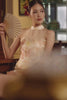 Roselia Whisper Qipao Set from CNY2026 Vol III capsule // The Roselia Whisper Qipao Set captures the softness of blooming petals at dawn—each flower motif delicately hand-embellished to shimmer with movement and light. The sheer mandarin neckline and scalloped hems add a delicate, romantic finish.