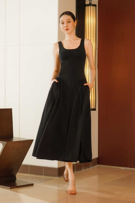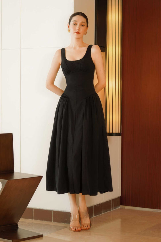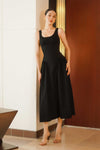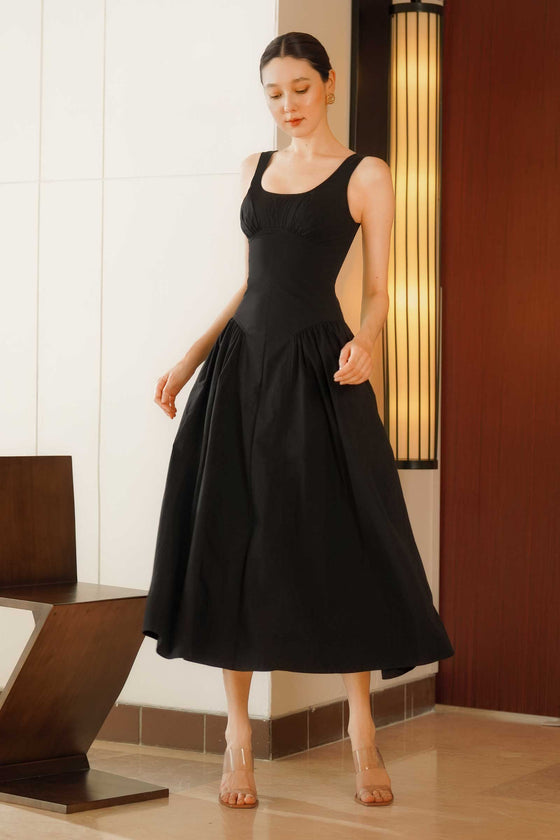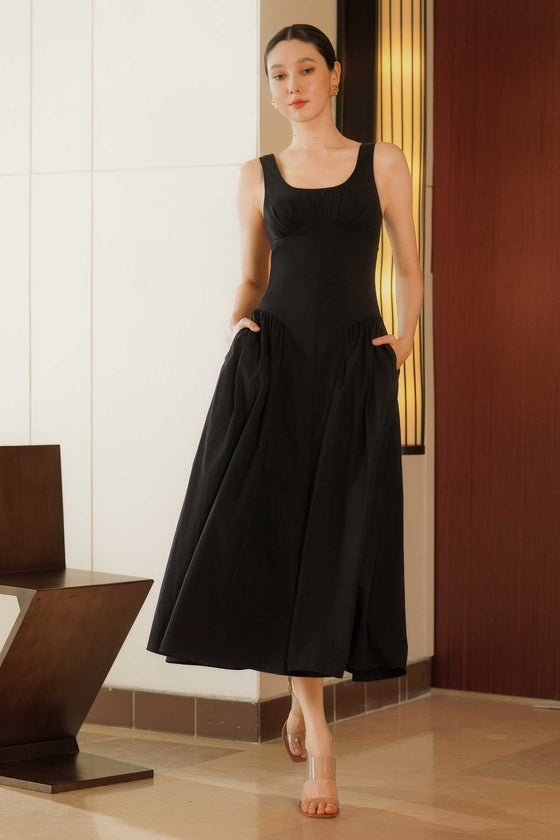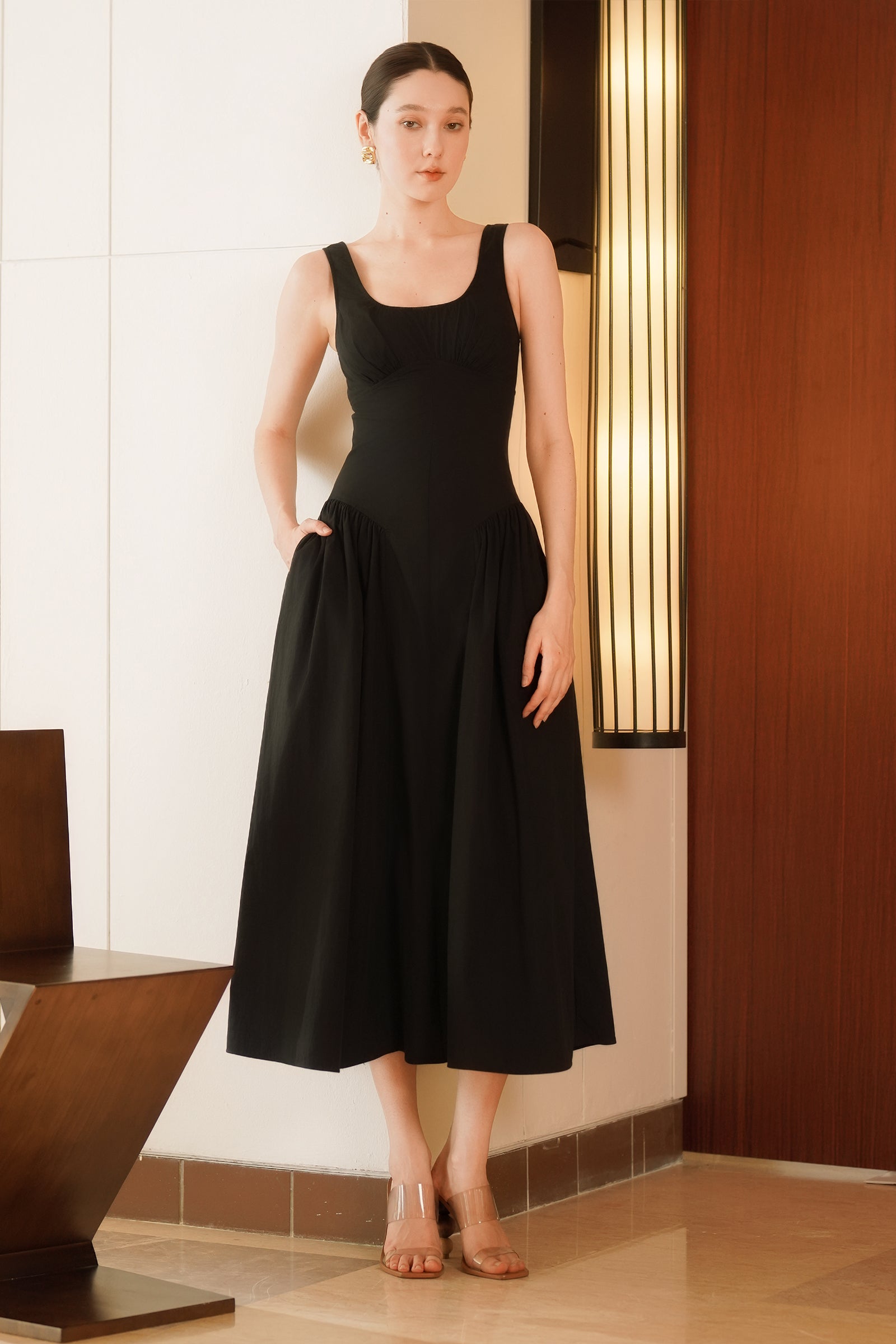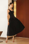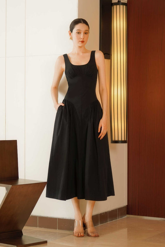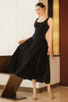 //DILMIRA DRESS// A refined take on modern femininity, featuring a structured padded bust and a flattering scoop neckline. Crafted from a lightweight poplin, the full midi skirt flows gracefully with every step, creating an effortlessly elegant silhouette. Functional side pockets add a subtle touch of ease, making it as practical as it is poised.