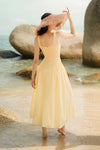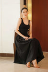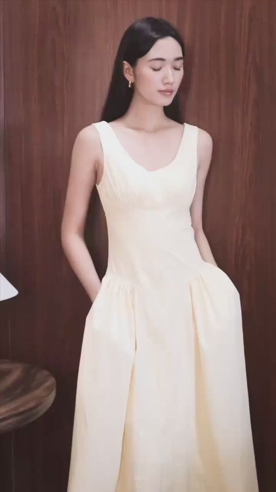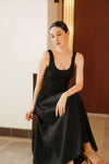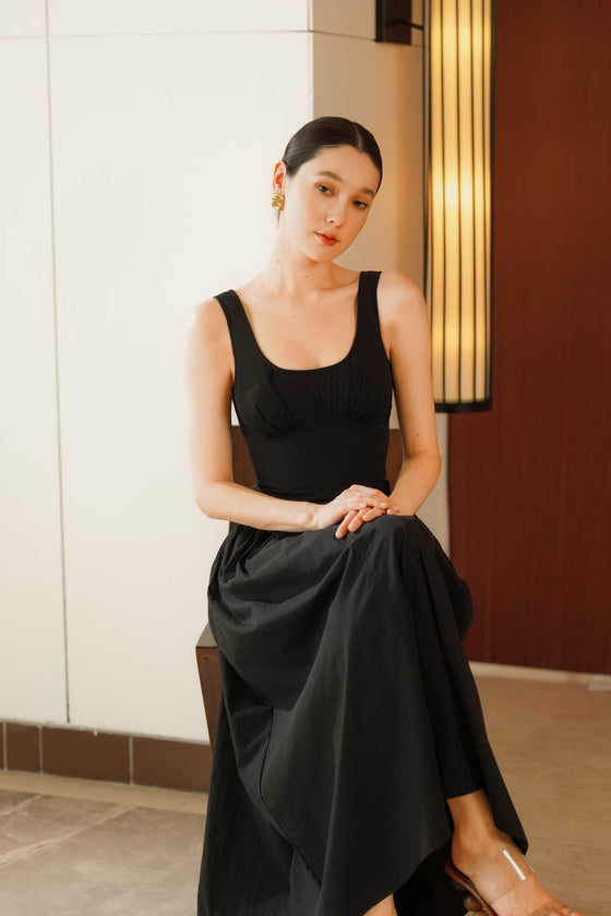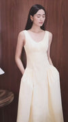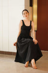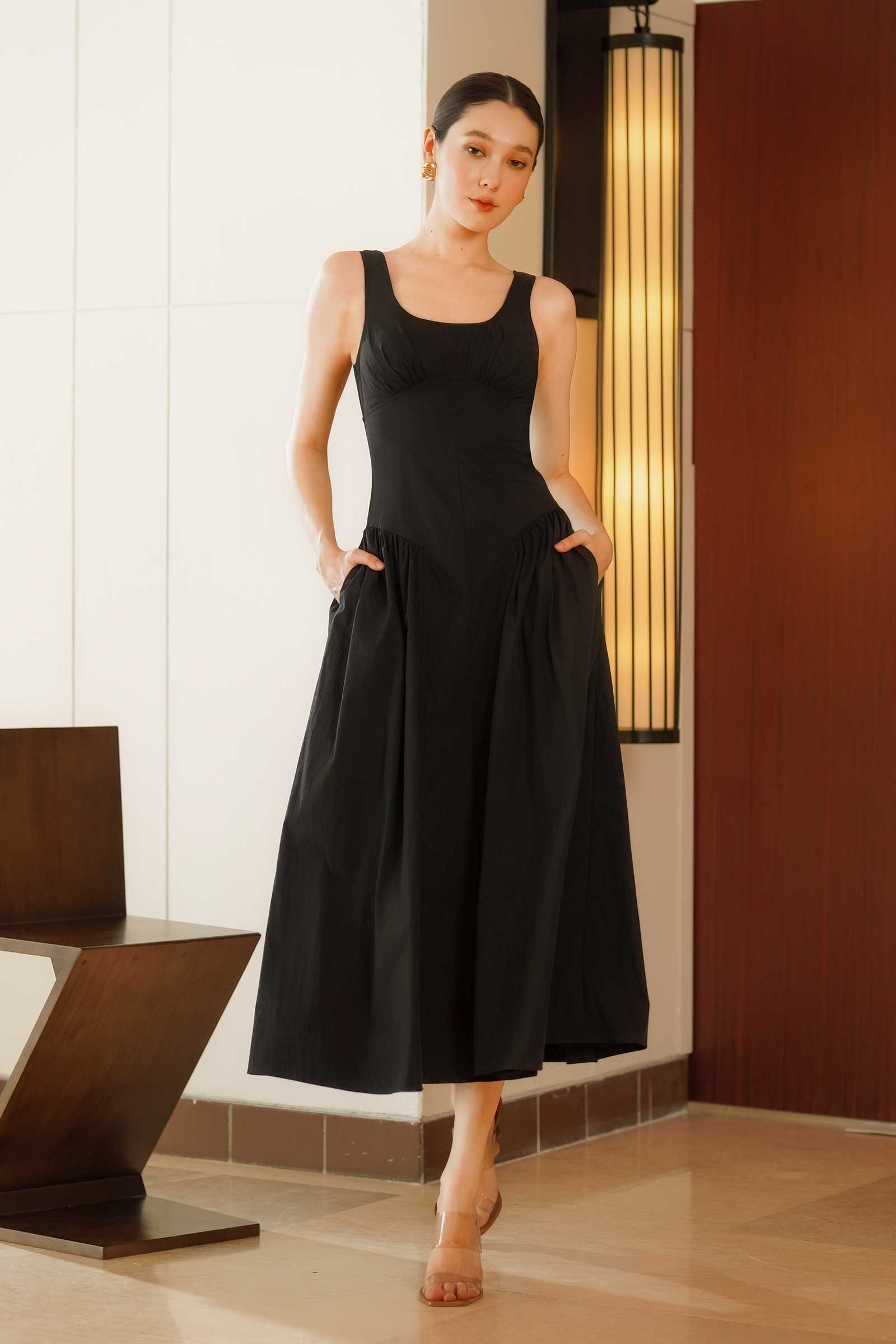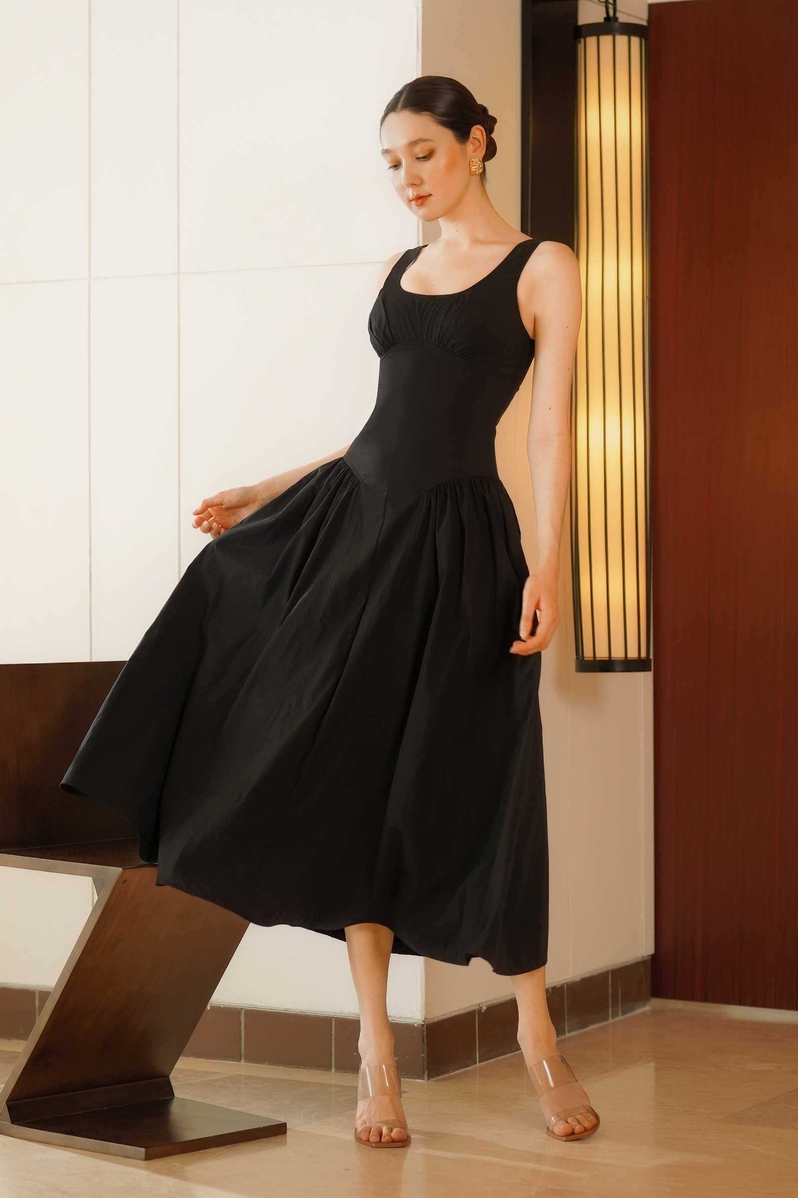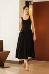 //DILMIRA DRESS// A refined take on modern femininity, featuring a structured padded bust and a flattering scoop neckline. Crafted from a lightweight poplin, the full midi skirt flows gracefully with every step, creating an effortlessly elegant silhouette. Functional side pockets add a subtle touch of ease, making it as practical as it is poised.